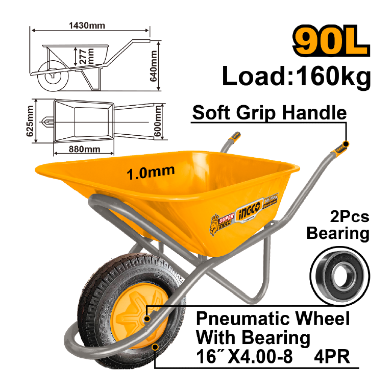 Tiene una capacidad de carga de hasta 150 kg, capacidad de agua de 90 litros y capacidad de arena de 6 CBF. Su rueda de 16"x4.00-8 garantiza estabilidad y maniobrabilidad incluso en terrenos irregulares. La estructura está fabricada en acero de espesor 1.0 mm, mientras que los mangos reforzados miden 1.2 x 32 mm, lo que proporciona un excelente control y resistencia.